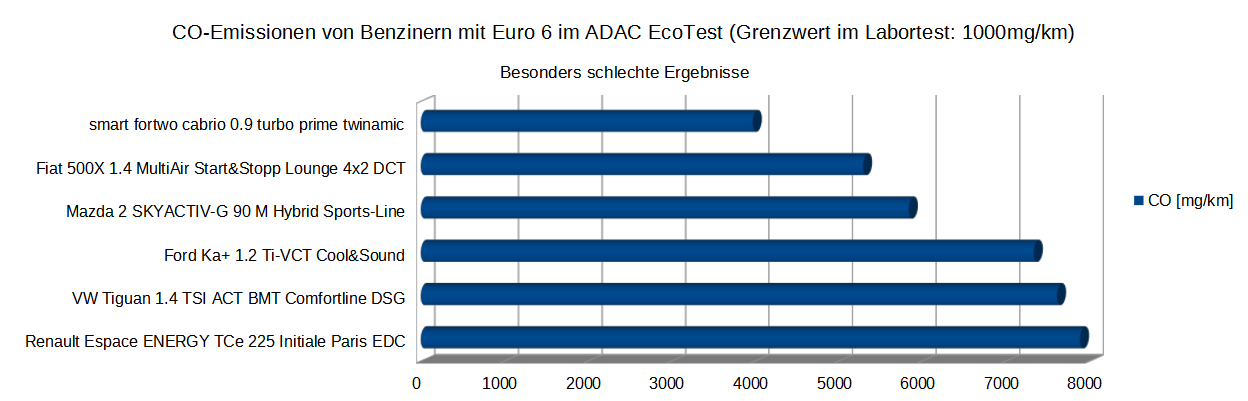 Des Weiteren überschreiten sehr viele Benziner (unabhängig von Direkteinspritzung oder nicht) im ADAC EcoTest den Grenzwert für Kohlenmonoxid (Benziner: 1000 mg/km, Diesel: 500 mg/km). Dies ist bei Fahrzeugen mit Euro 6b systematisch erkennbar, seit der ADAC im September 2016 begonnen hat, im Rahmen der Aktualisierung des EcoTests alle gemessenen Werte zu veröffentlichen. Das folgende Bild zeigt ausgewählte besonders schlechte Beispiele. Bemerkenswert daran ist, dass der Mazda im Beispiel sogar ein Fahrzeug mit Euro 6d ist: