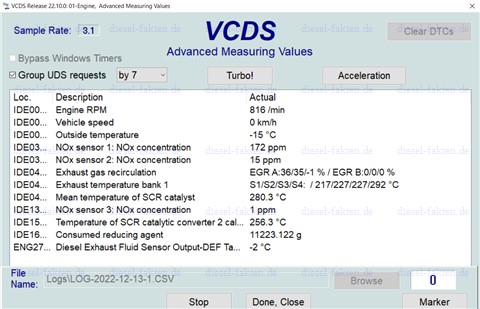 Schauen wir uns zunächst Daten an, die ich aus meinem Fahrzeug der Abgasnorm Euro 6d ausgelesen habe.