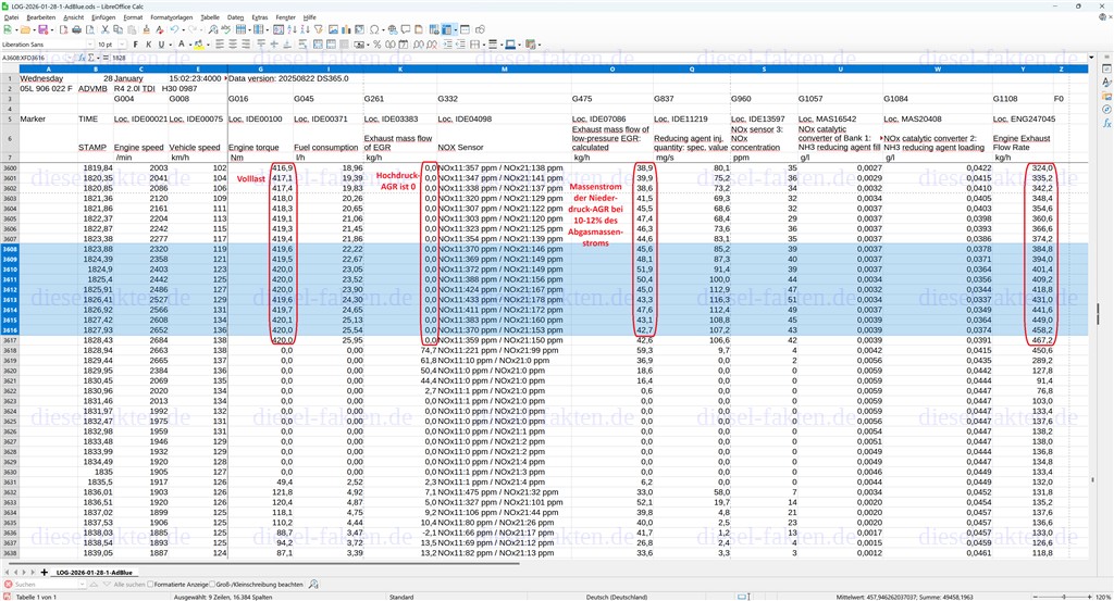 Praktisch jeder KfZ-Mechatroniker lernt in der Ausbildung, dass die Abgasrückführung dazu dient, bei Teillast einen Teil der Abgase zurückzuführen. Das ist spätestens seit 2020 aber überholt. Der folgende Ausschnitt zeigt eine AGR-Rate im Bereich von 10-12% für die Niederdruck-AGR bei Volllast bei einer Drehzahl von 2.000/min bis 2.600/min. Die Volllast ist daran zu erkennen, dass das Motorsteuergerät hier ein Drehmoment von etwa 420 Nm meldet. Die Beschleunigung findet dabei im 6. von 7 Gängen statt, (für mich) nachvollziehbar anhand der Drehzahl. Der gesamte Abgasmassenstrom bewegt sich in diesem Ausschnitt zwischen 330 kg/h und 460 kg/h, der Massenstrom der Niederdruck-AGR zwischen 39 kg/h und 52 kg/h.